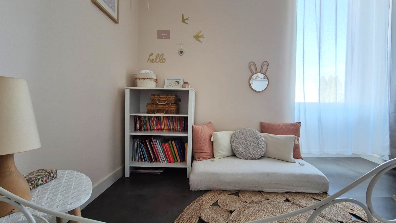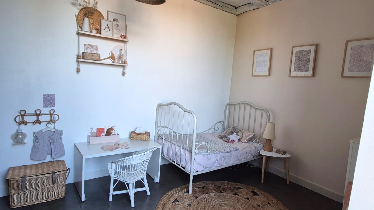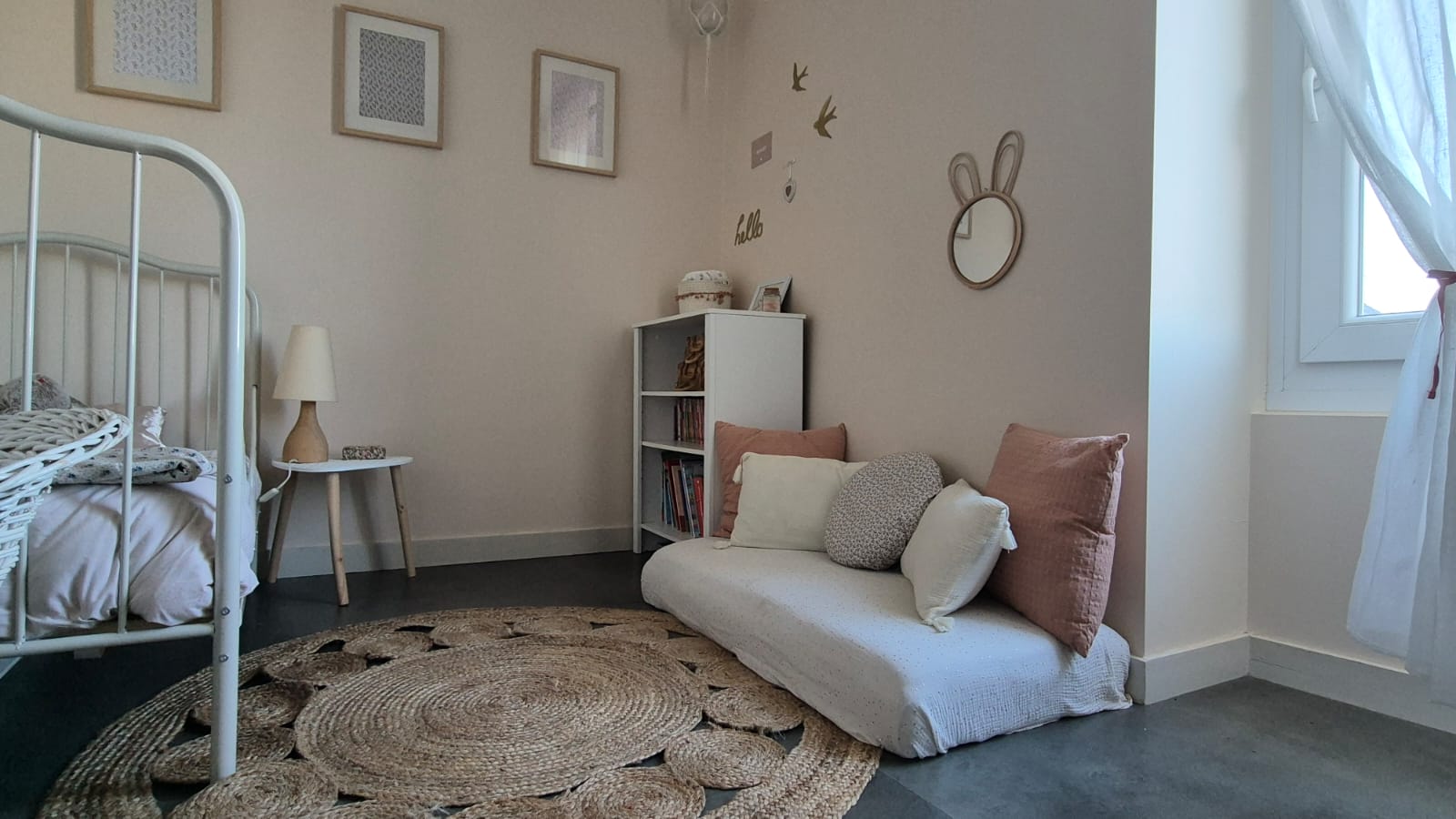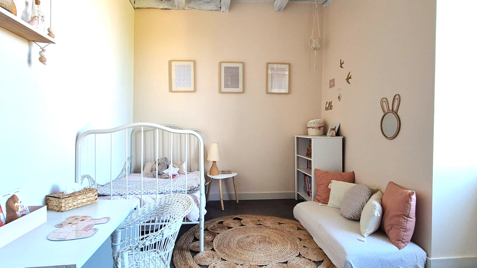 Ici par le choix d’une couleur adaptée à l’exposition et au goût des clients, la pièce a retrouvé toute sa luminosité. Par les accessoires de décoration et l’utilisation de mobilier déjà présent dans la maison, une jolie pièce a pris vie pour faire rêver cette petite poupée.