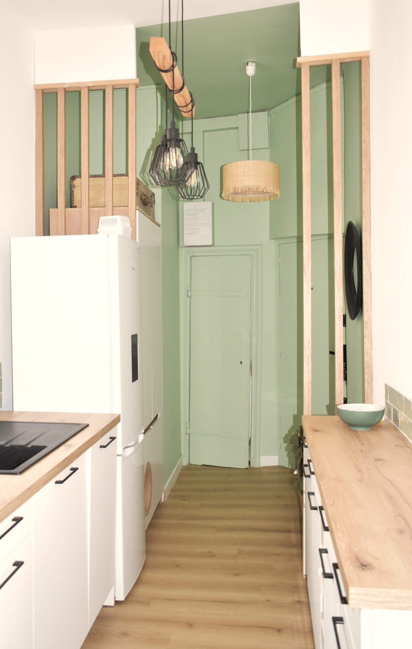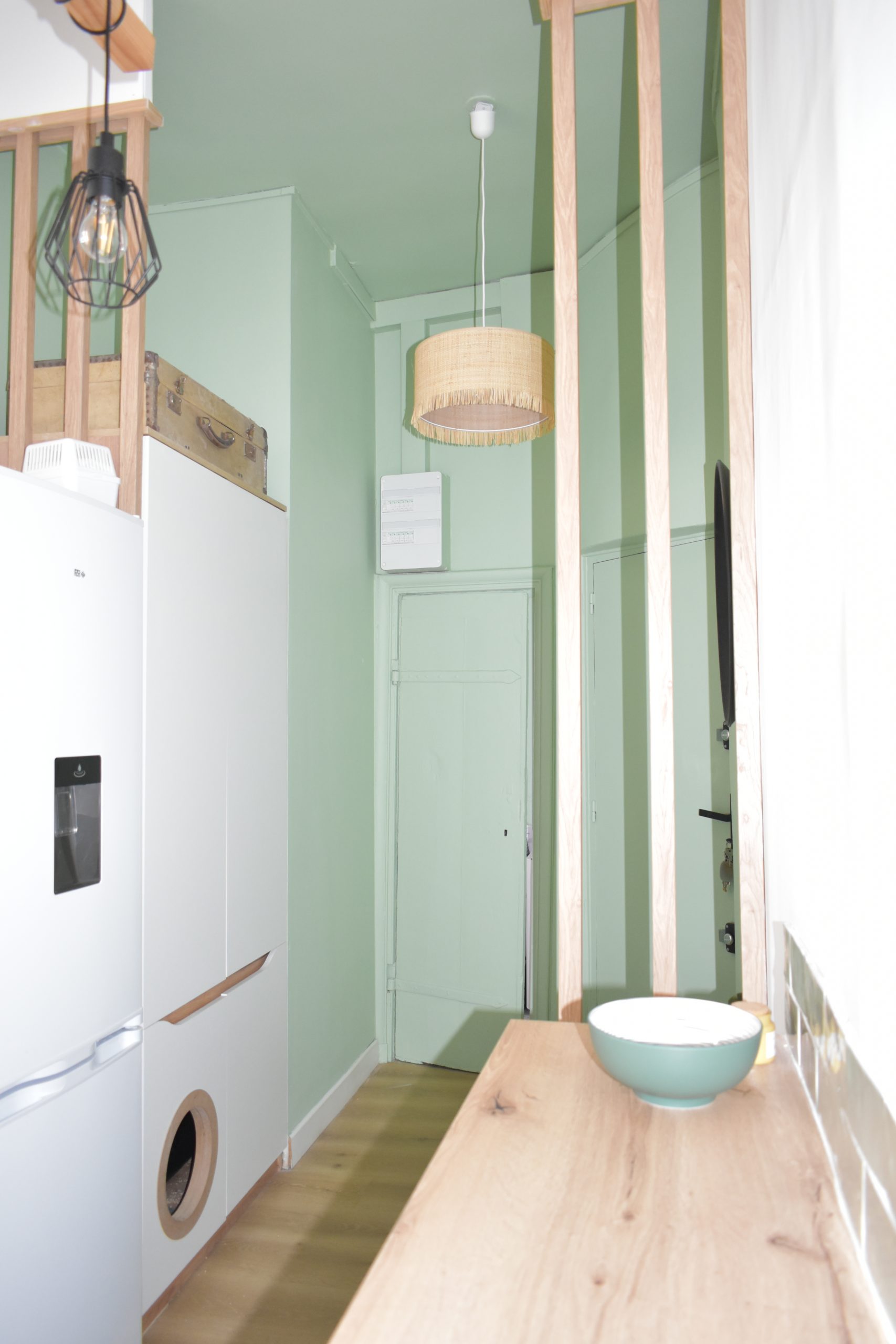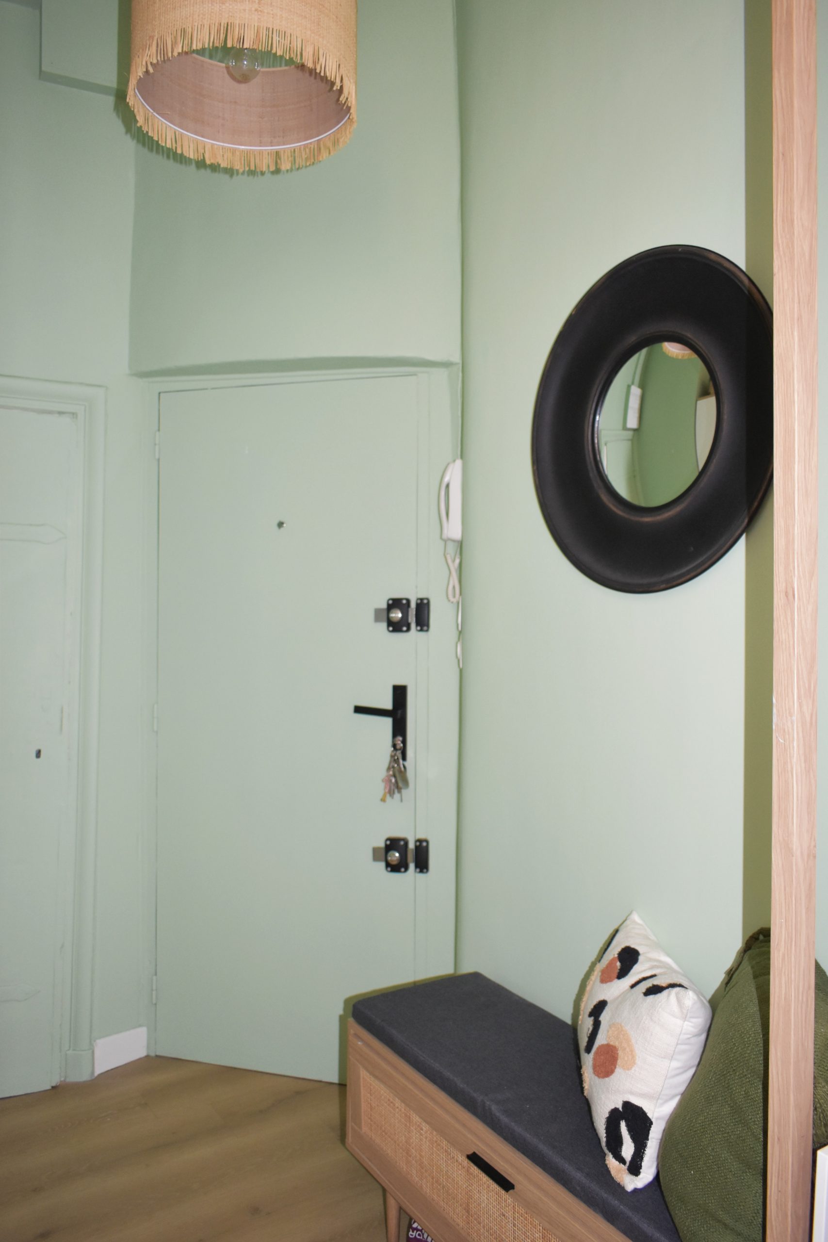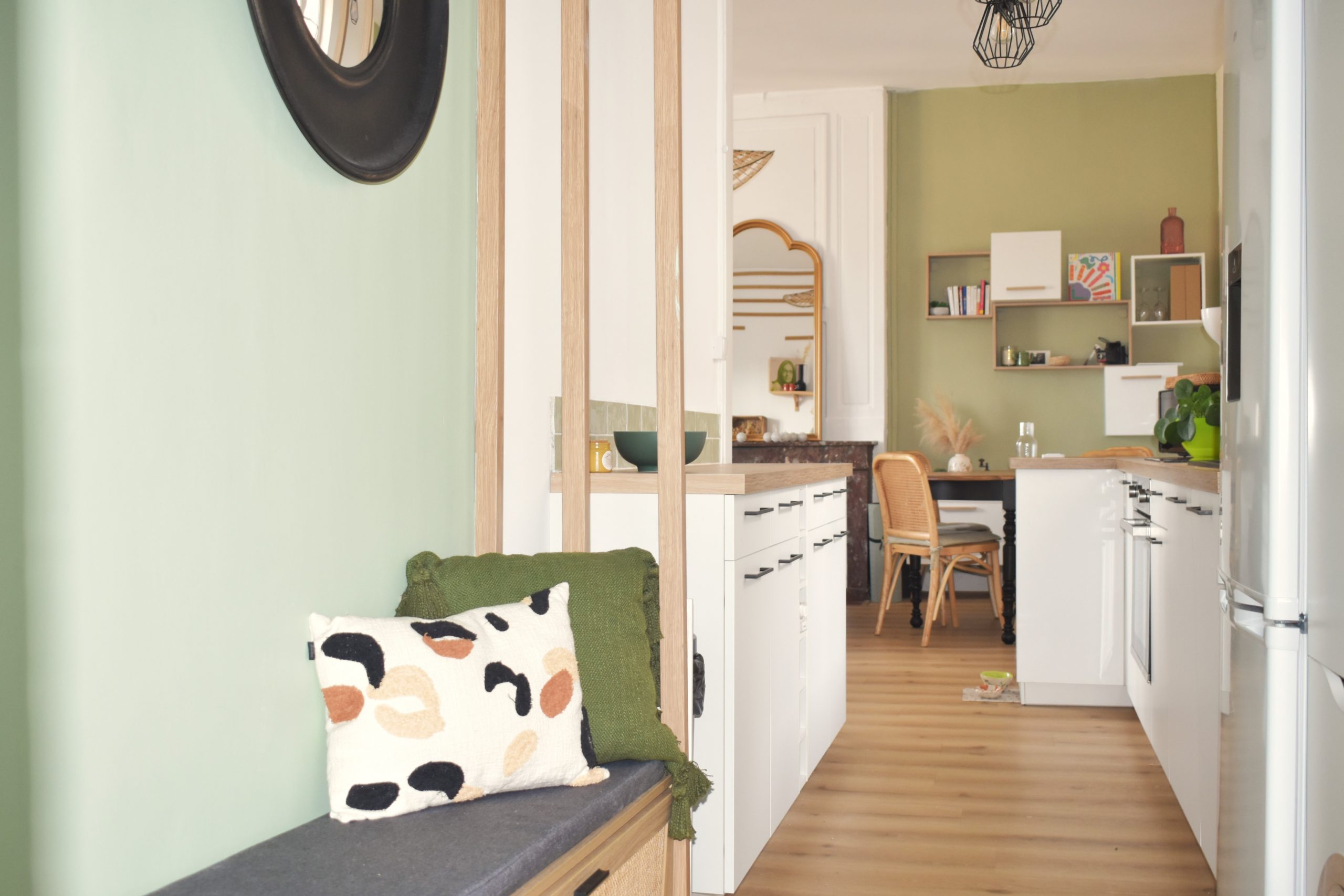 Rapidement je lui ai proposé de séparer le sas de l’entrée et sa cuisine pour éviter cet effet de couloir. L’idée était de tout de même garde de la luminosité et donc ne pas cloisonner. Nous avons opté pour des claustras pour séparer les espaces, ainsi que le trompe l’oeil du color block vert pour détacher visuellement l’entrée.