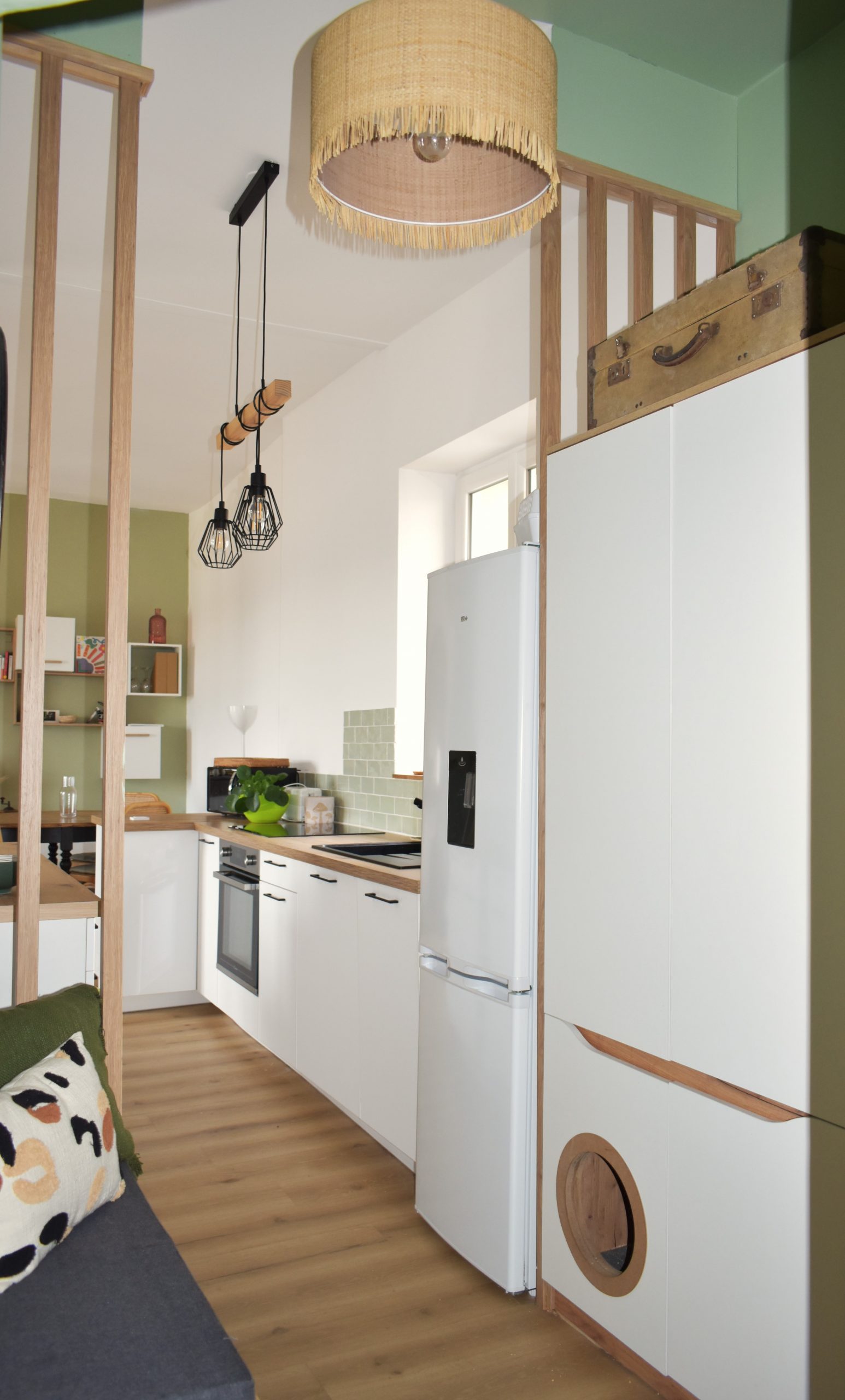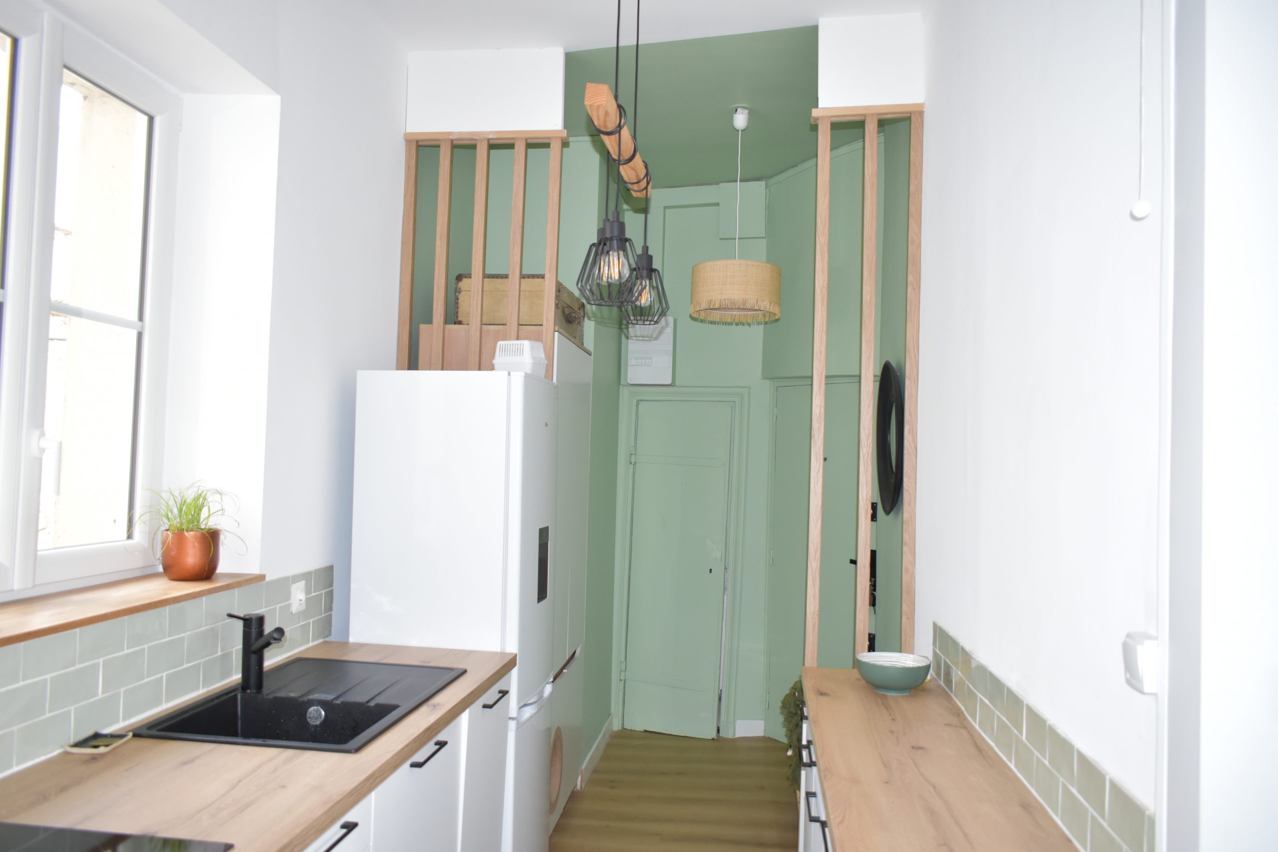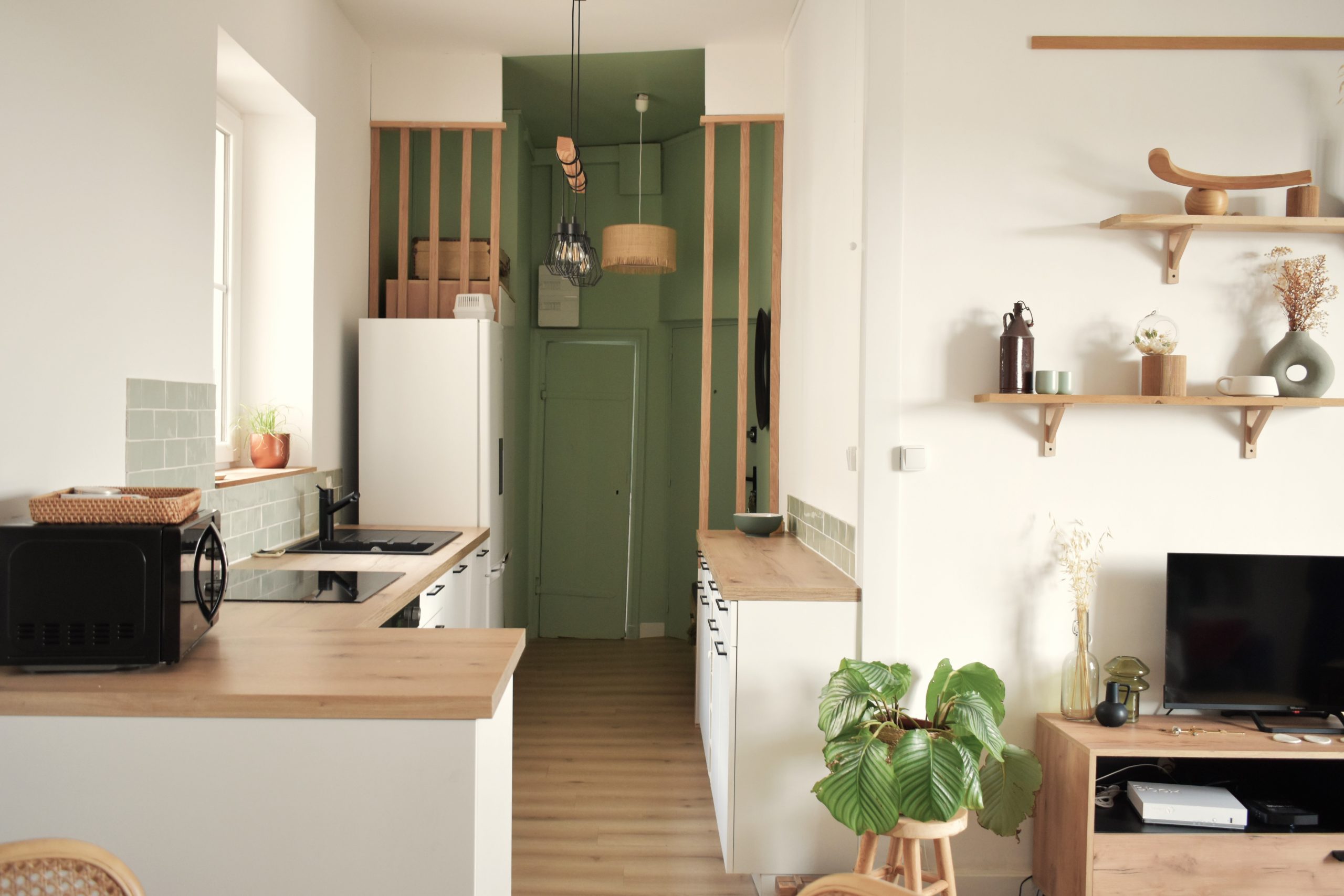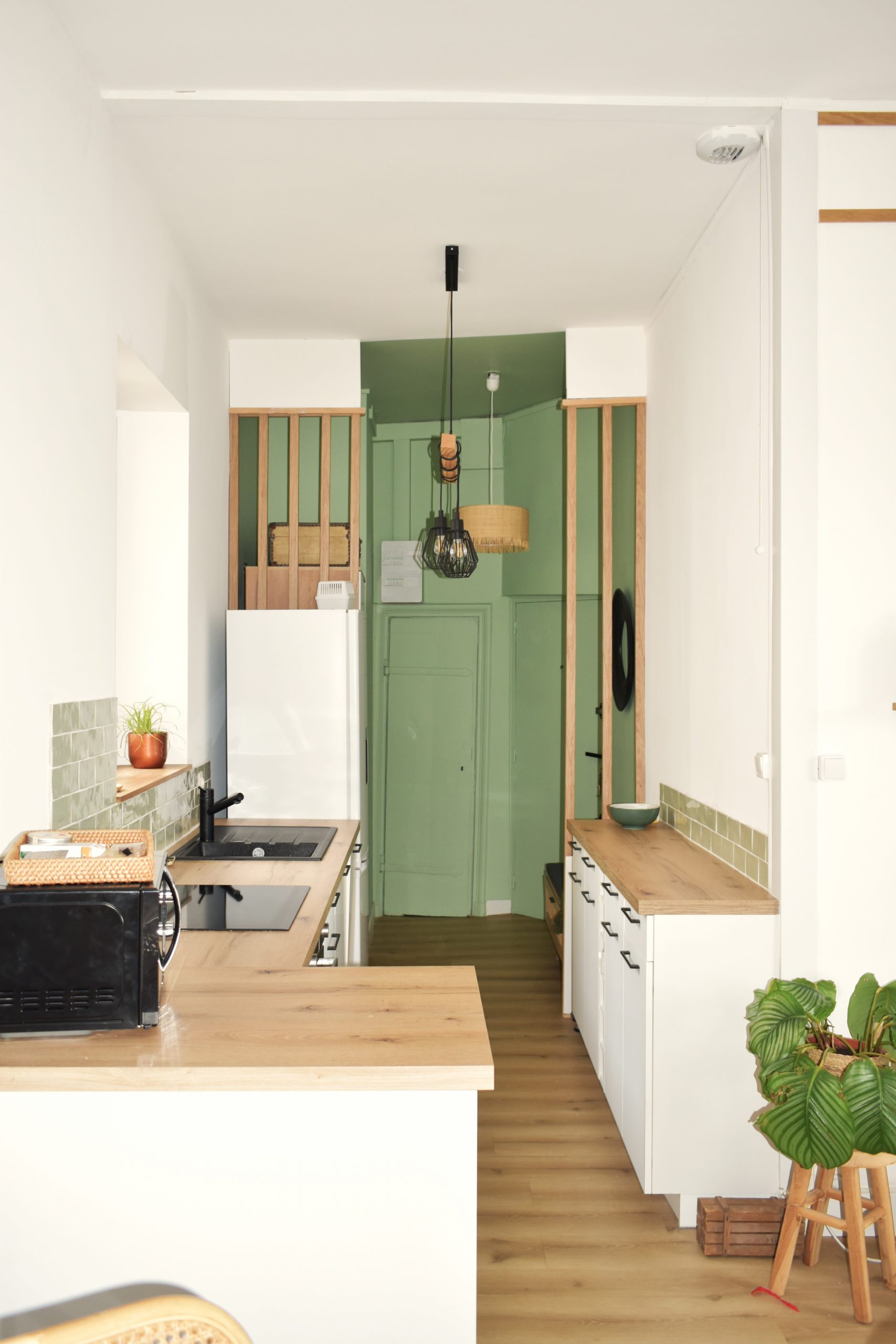 Rapidement je lui ai proposé de séparer le sas de l’entrée et sa cuisine pour éviter cet effet de couloir. L’idée était de tout de même garde de la luminosité et donc ne pas cloisonner. Nous avons opté pour des claustras pour séparer les espaces, ainsi que le trompe l’oeil du color block vert pour détacher visuellement l’entrée.